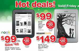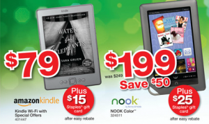 No matter what you choose, Staples is the perfect place to buy since they’re offering gift cards with every purchase, like a $15 card with a $79.99 Kindle WiFi, a $25 card with a NOOK Color, and $20 gift cards each for the NOOK Simple Touch ($99) and the Kindle Touch ($149). These are the best prices you’re gonna get anywhere, and the Staples gift card is just icing on the cake.