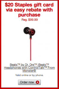 Fans of Dre’s series of Beats headphones know that these babies don’t go on sale often. In fact, they haven’t gone on sale at Staples but you are getting the next best thing: a $20 gift card from Staples with the purchase.