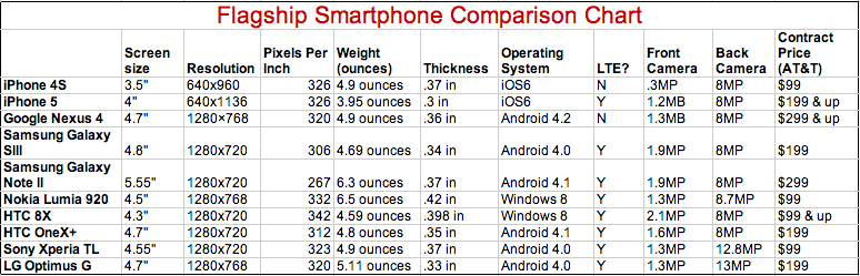 Check out the chart below, and let us know if you have any question in the comments. All of the phones are shown with a contract price (we used AT&T because they’re our partner), except the Google Nexus. The Google Nexus is sold unlocked through the Google Play store, not on contract at AT&T.