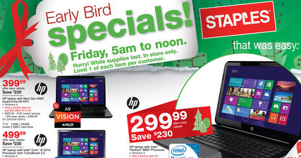 And don’t forget! They also have mobile flash sales you can take part in by visiting Staples.com from your smartphone. They’ll be hooking you up with hourly coupons you can use online only starting 11 p.m Thursday and running until 5 a.m. on Black Friday. You can also use coupons you find on in-store from 5 a.m. to 12 p.m on Friday.